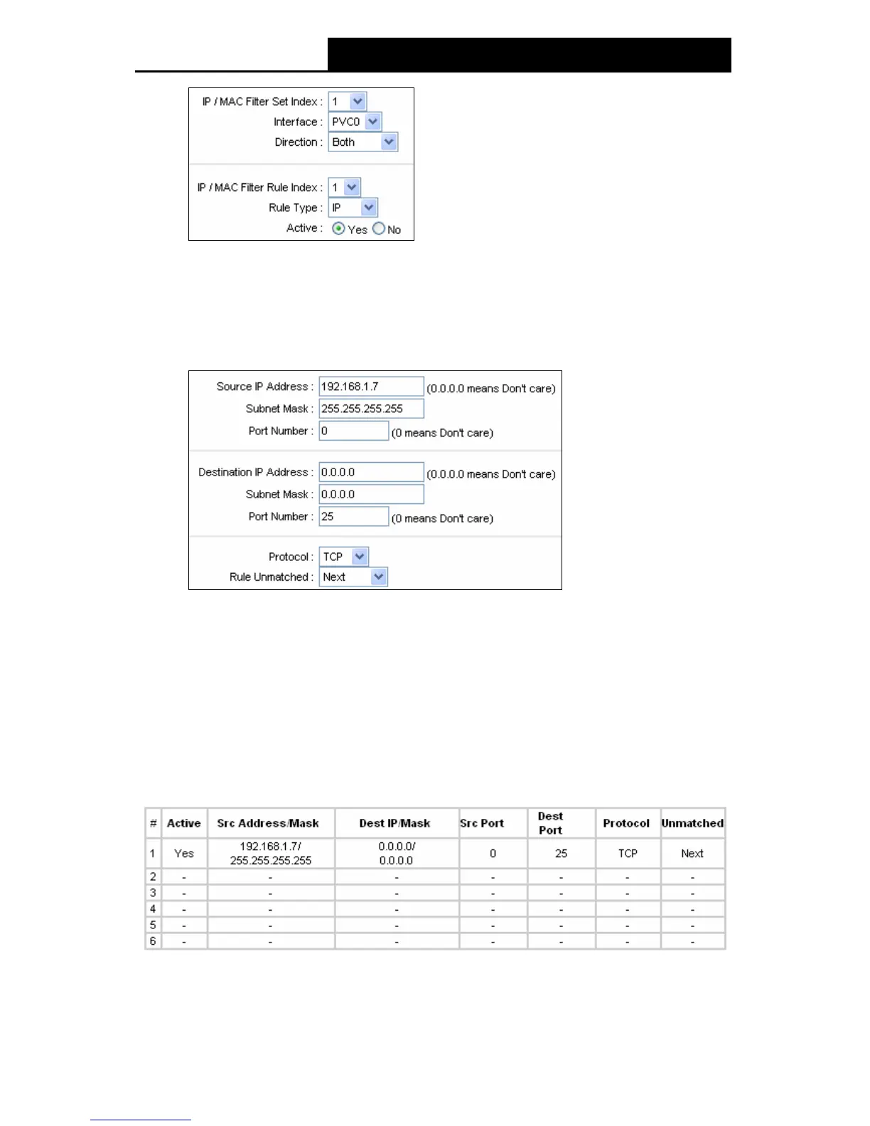 / MAC Filter Set Index and IP/MAC Filter Rule Index to view or modify the entry.