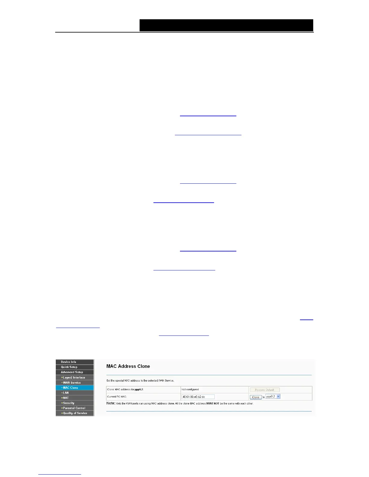 Choose menu “Advanced Setup”Æ“MAC Clone”, you can configure the MAC address of the