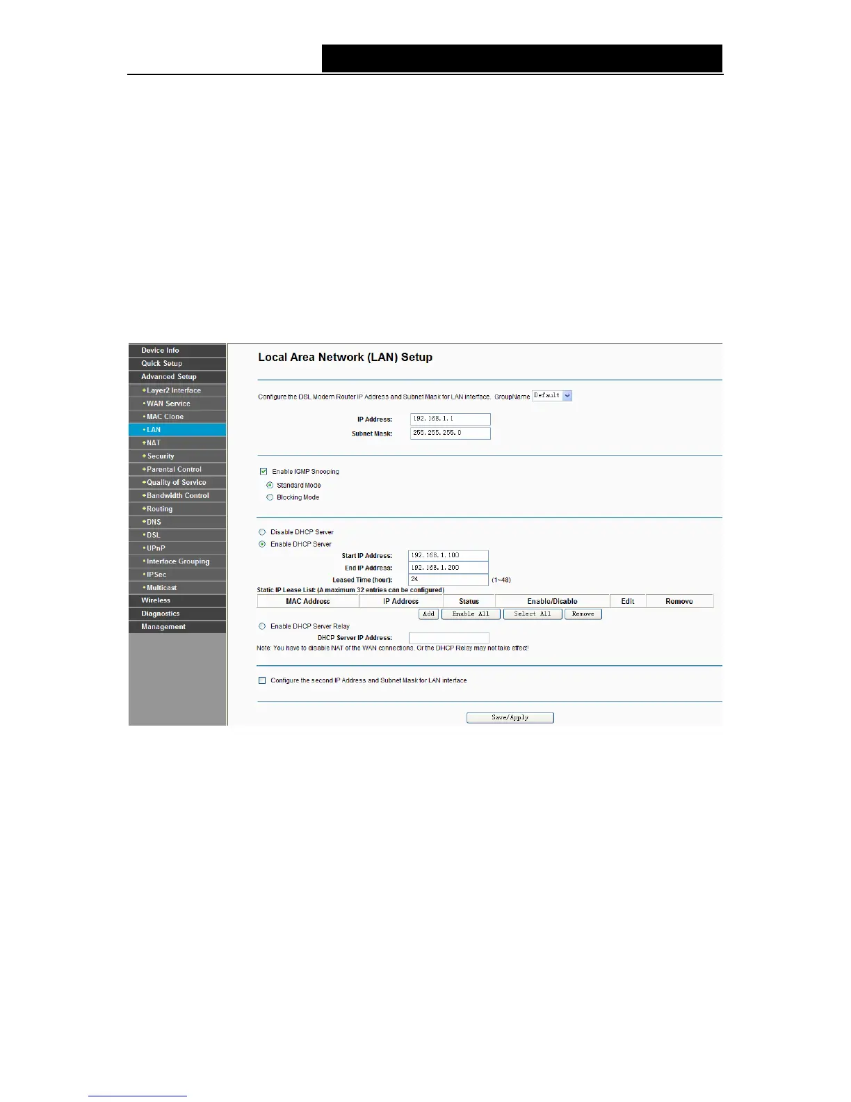 Choose “Advanced Setup”Æ“LAN”, and you will see the LAN screen (shown in Figure 4-21), the