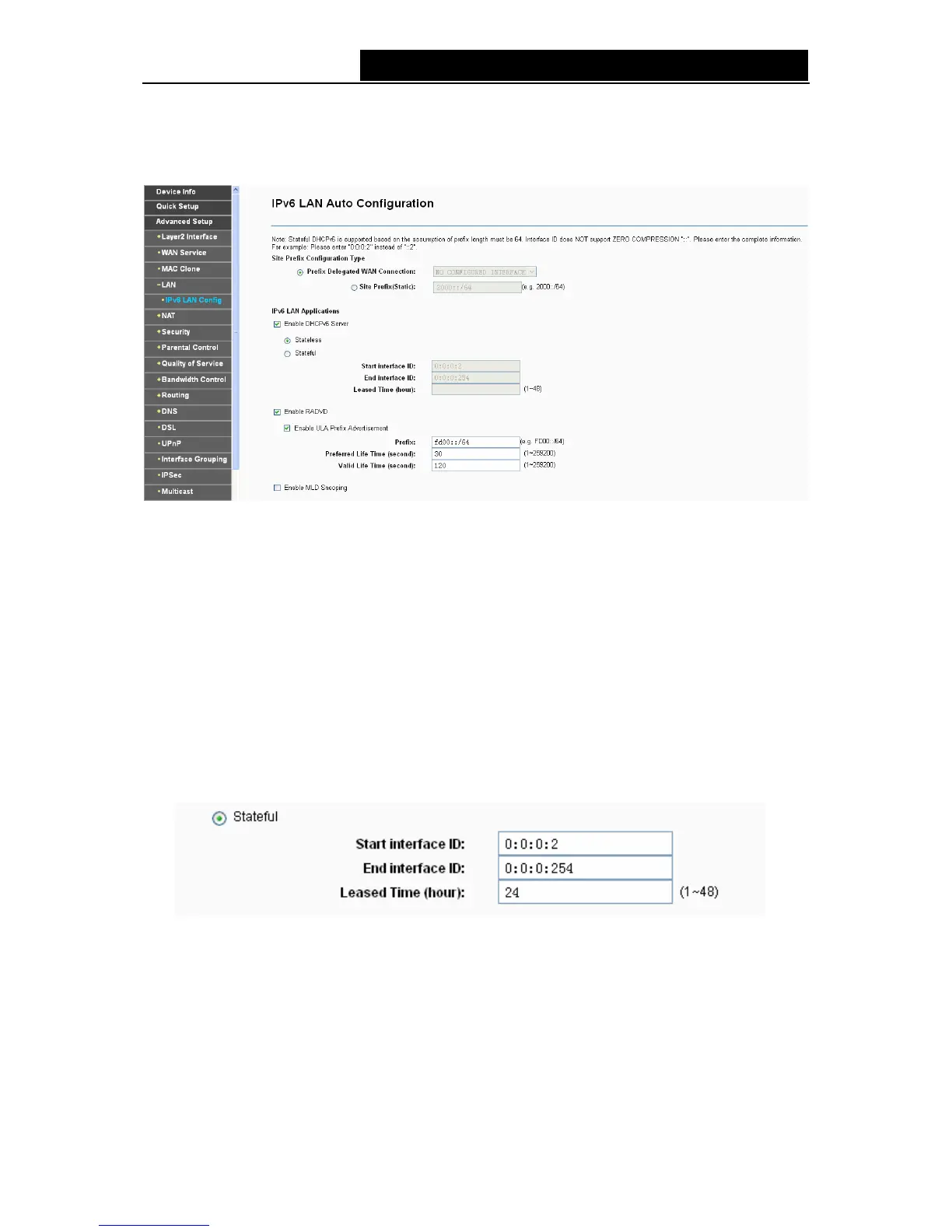 Choose “Advanced Setup”Æ“LAN” Æ”IPv6 LAN Config”, and you will see the screen (shown in