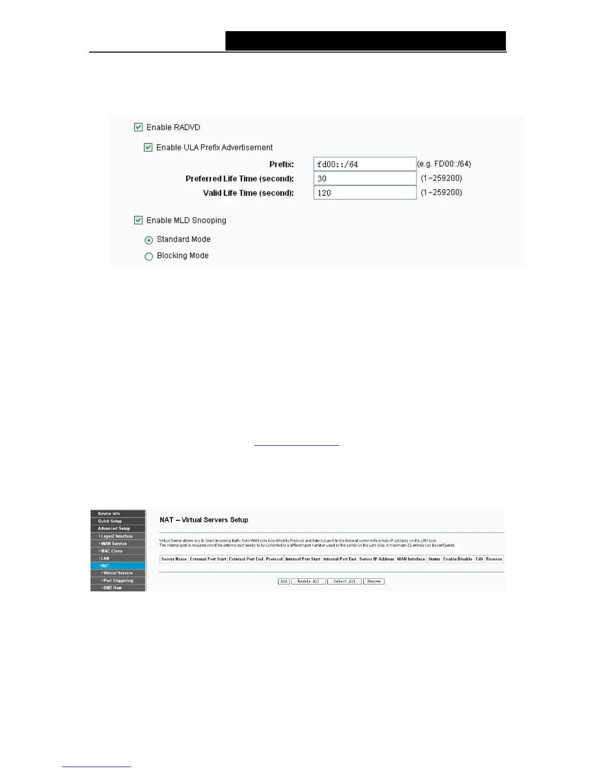 Choose “Advanced Setup”Æ“NAT”, there are three submenus under the main menu: Virtual