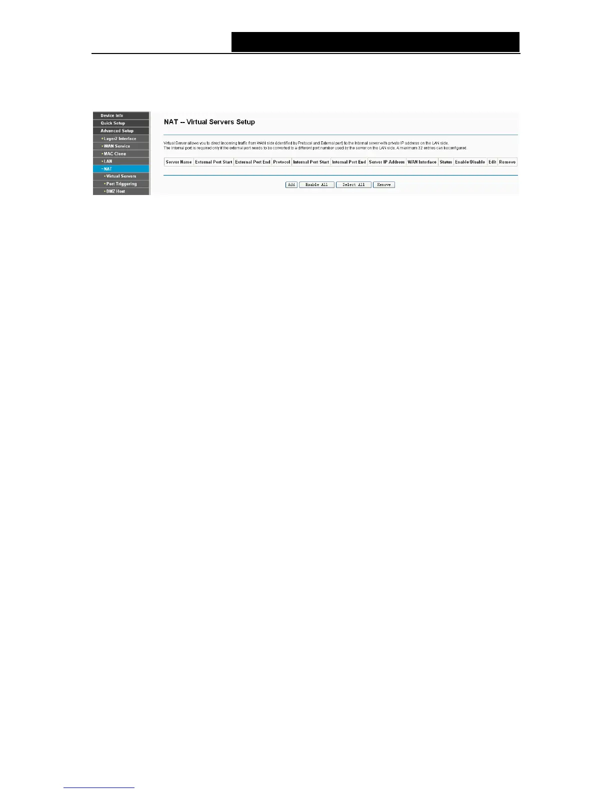 ¾ Virtual Server Table: The table indicates the information about the Virtual Server entries.