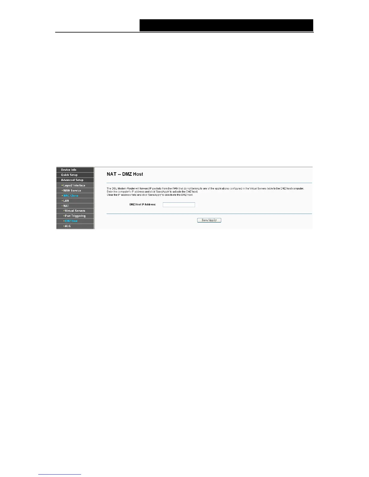 Choose “Advanced Setup”Æ“NAT”Æ“DMZ Host”, you can set up DMZ Host on the screen