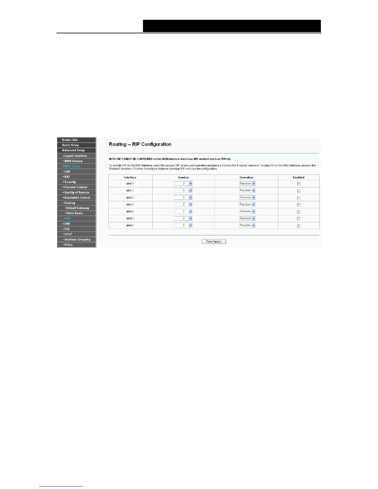 Choose “Advanced Setup”Æ“Routing”Æ“RIP”, you can see the RIP (Routing Information