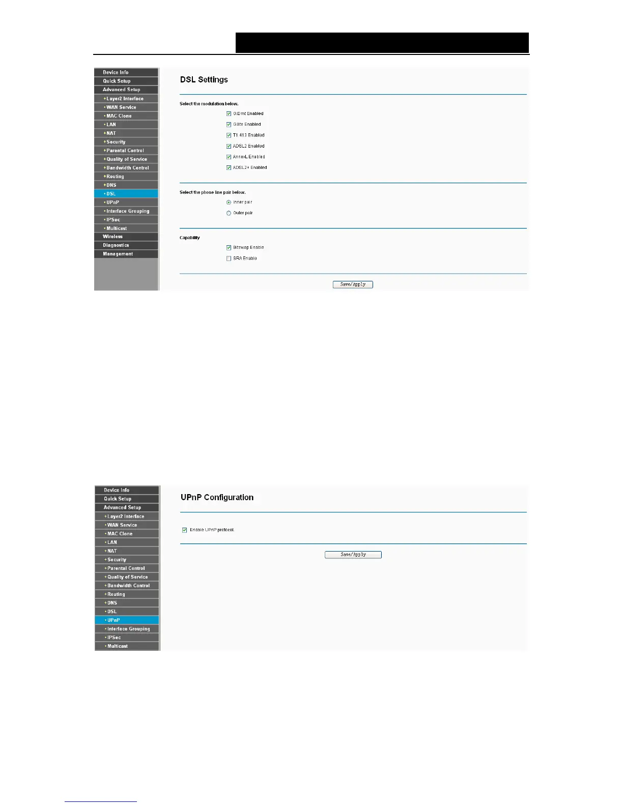 Select the checkbox and click Save/Apply to enable the UPnP function.