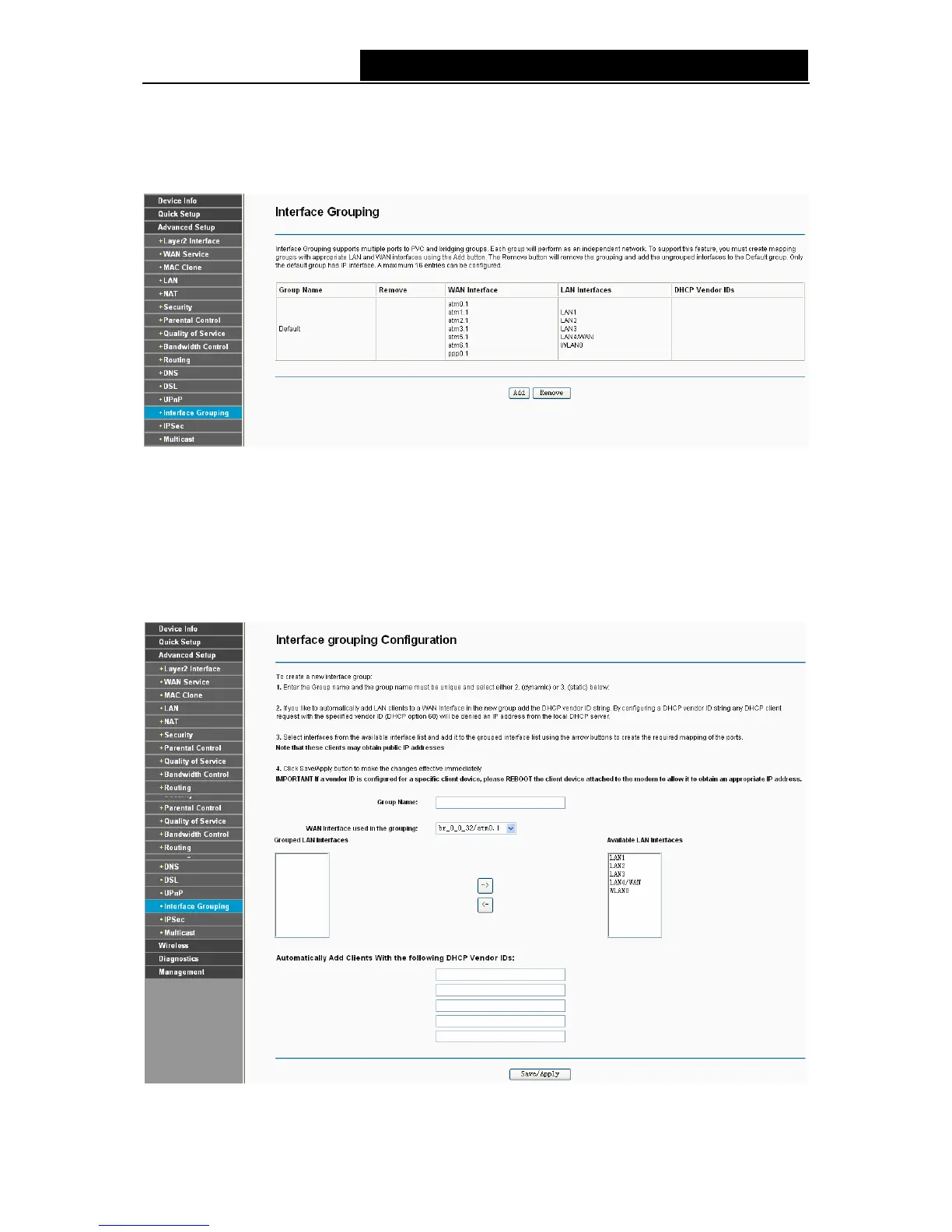 interfaces using the Add button. The Remove button will remove the grouping and add the
