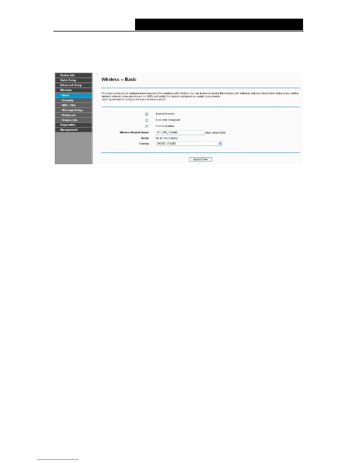 Choose “Wireless”Æ”Basic”, you will see the screen of Wireless--Basic settings shown as below.