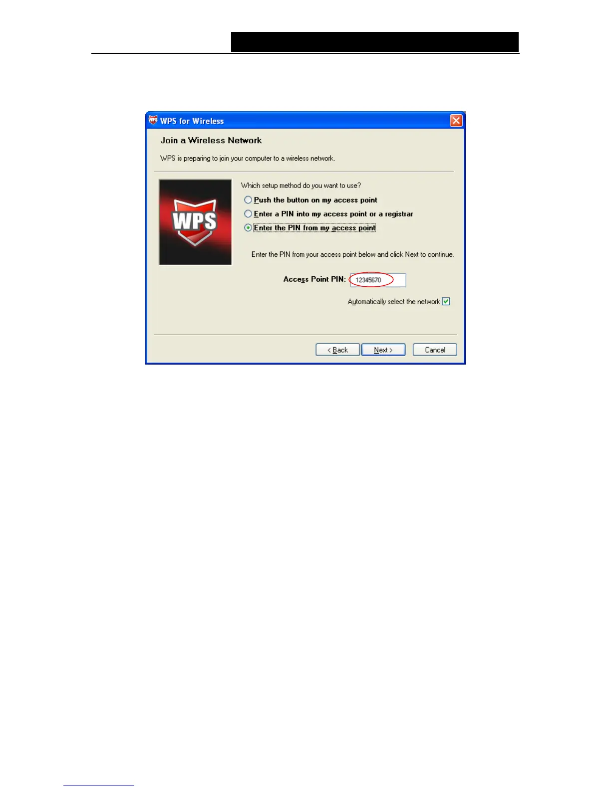 access point” in the configuration utility of the WPS as below, and enter the PIN code of