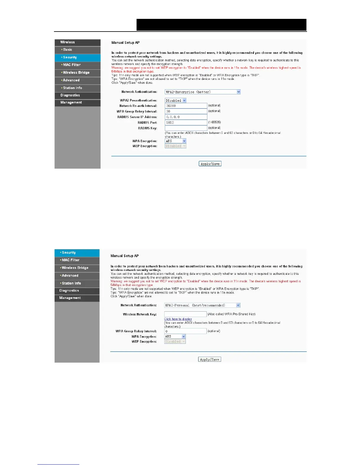 To configure Mixed WPA2/WPA Enterprise settings, select the Mixed WPA2/WPA Enterprise