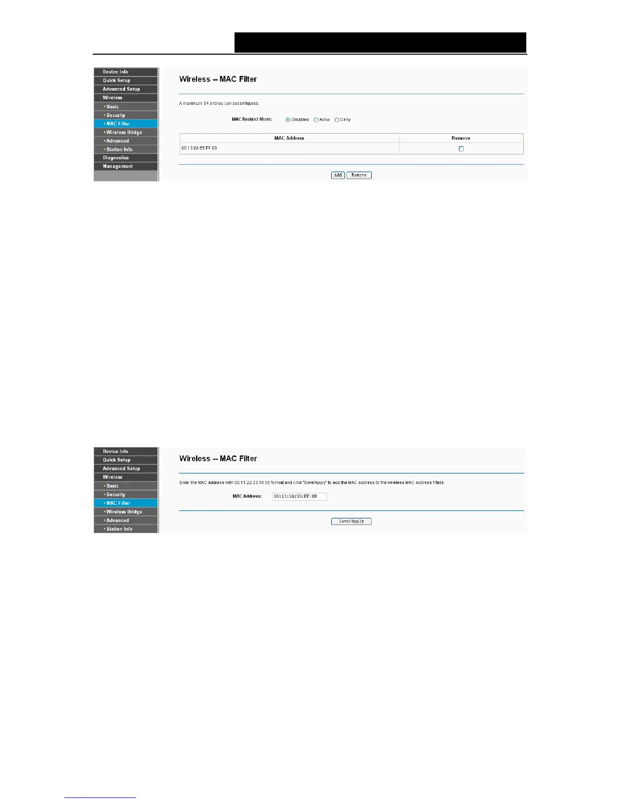 ¾ Remove: Select the item of the MAC Address and click this button to remove it.