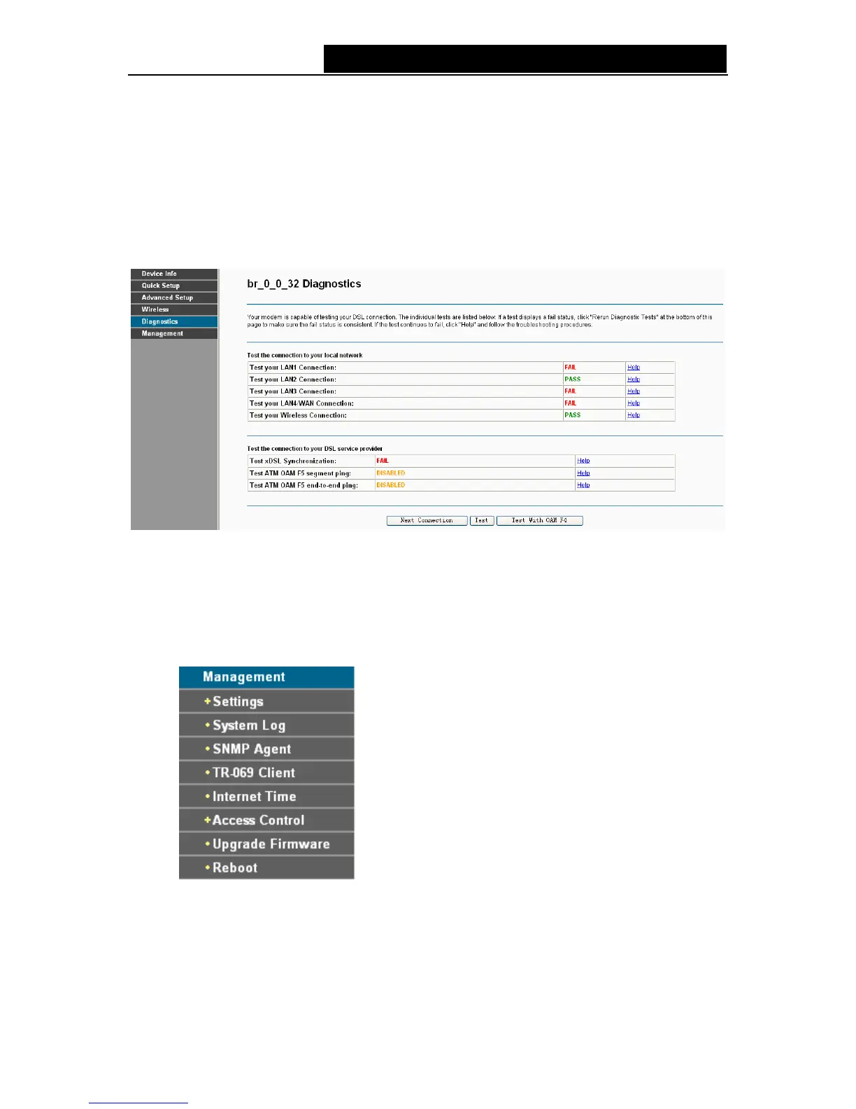 the test for the ENET (Ethernet) Connection, Wireless Connection and ADSL Synchronization.