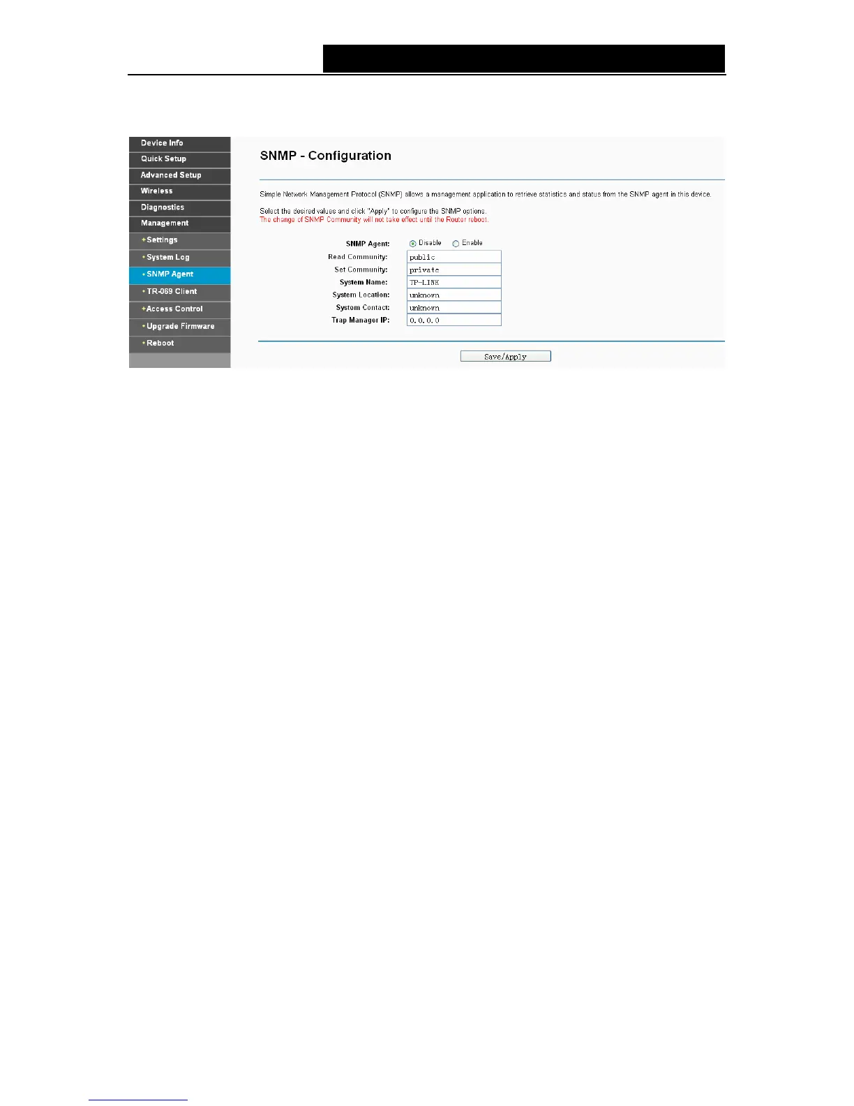 Select the desired values and click Save/Apply to configure the SNMP options.