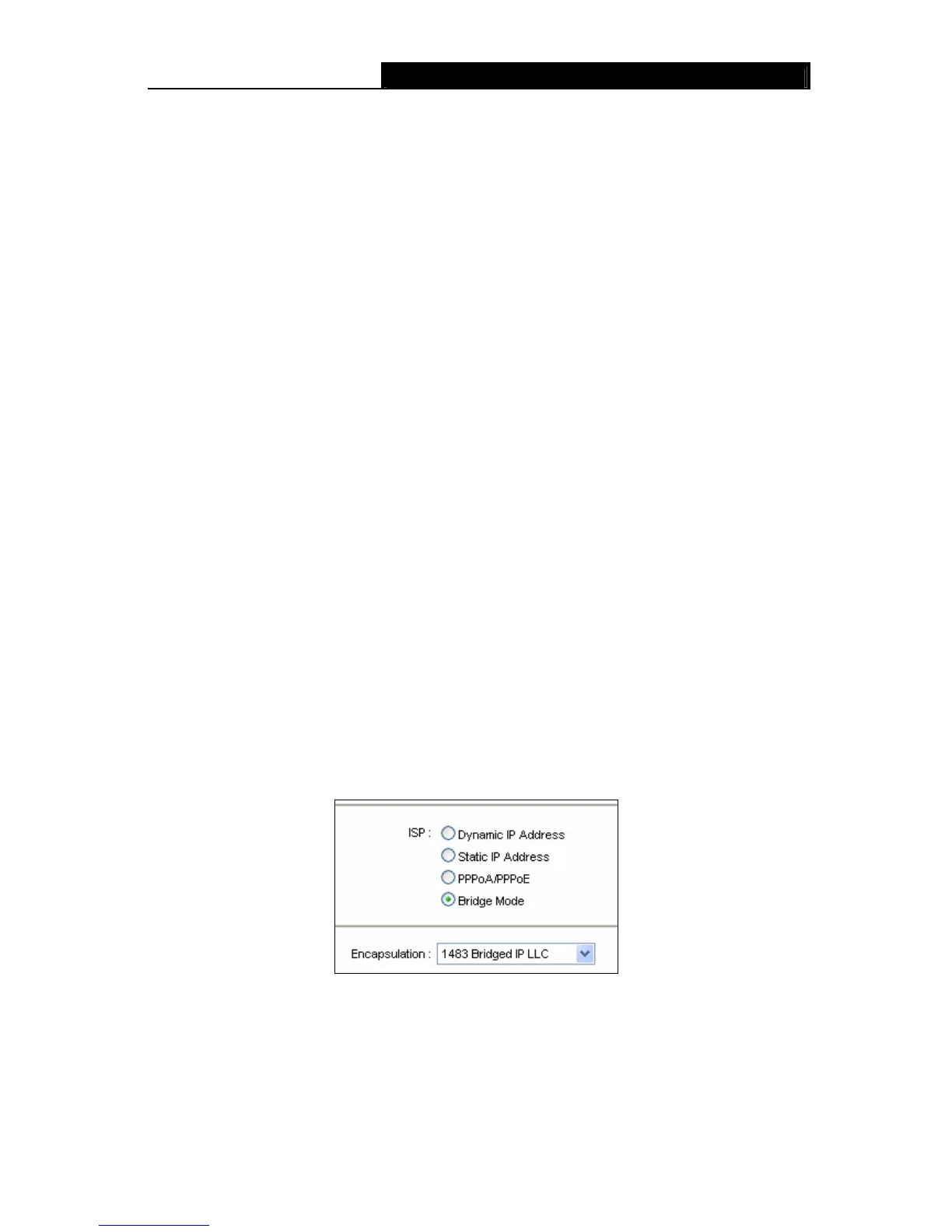 If you select this type of connection, the modem can be configured to act as a bridging device