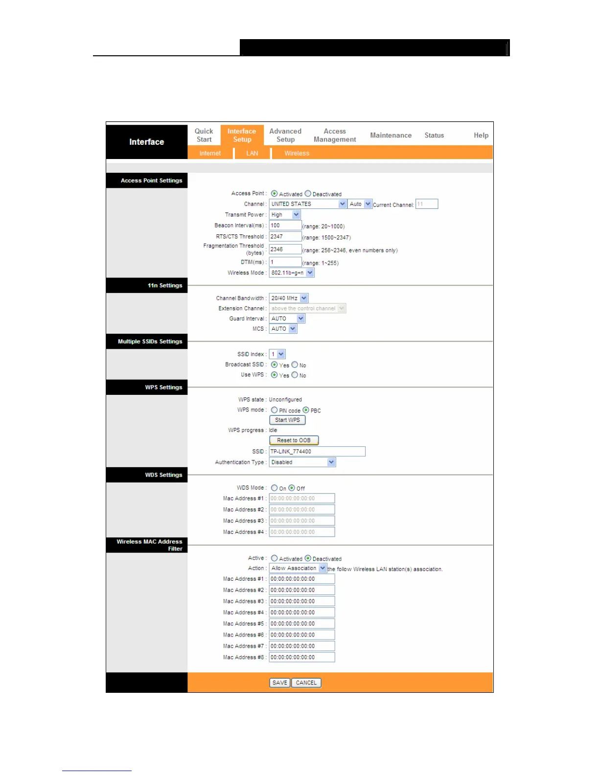 Choose “Interface SetupWireless” menu, and you will see the Wireless screen (shown in
