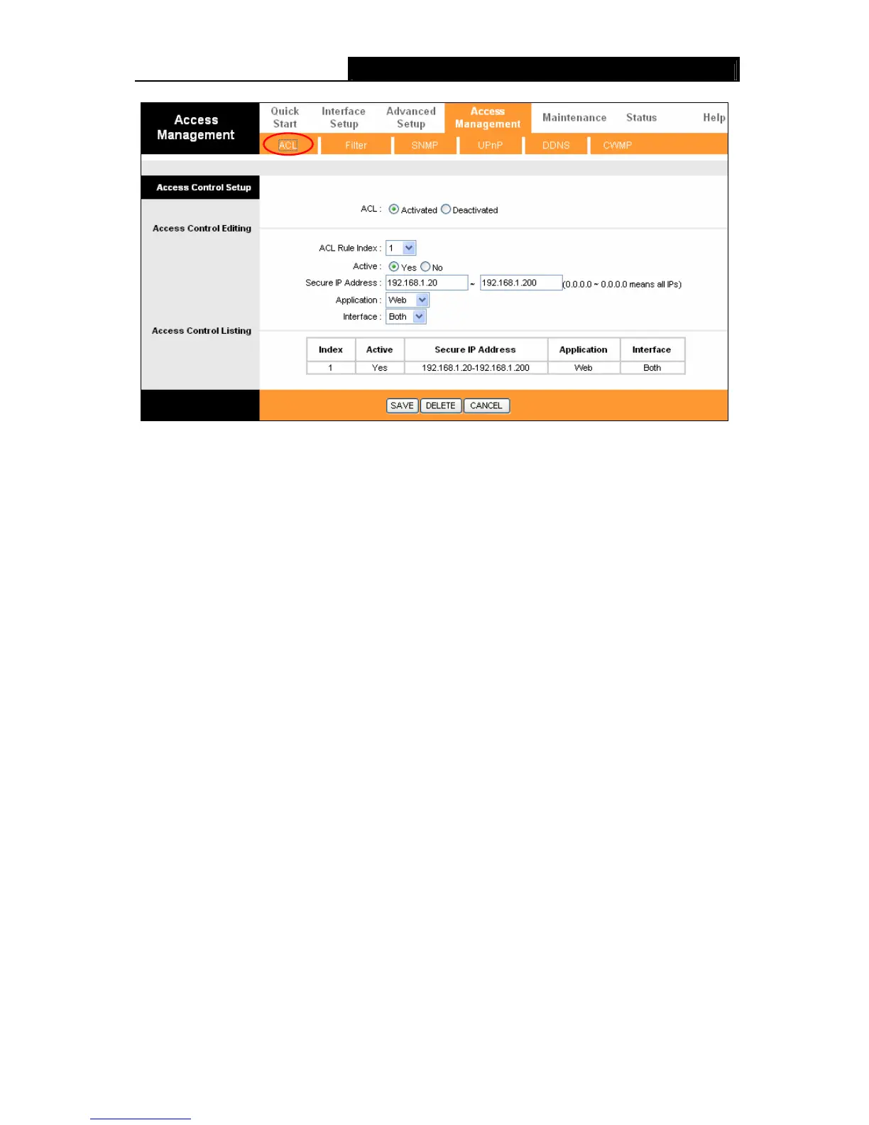 ¾ Interface: Select the interface for access: LAN, WAN or Both.