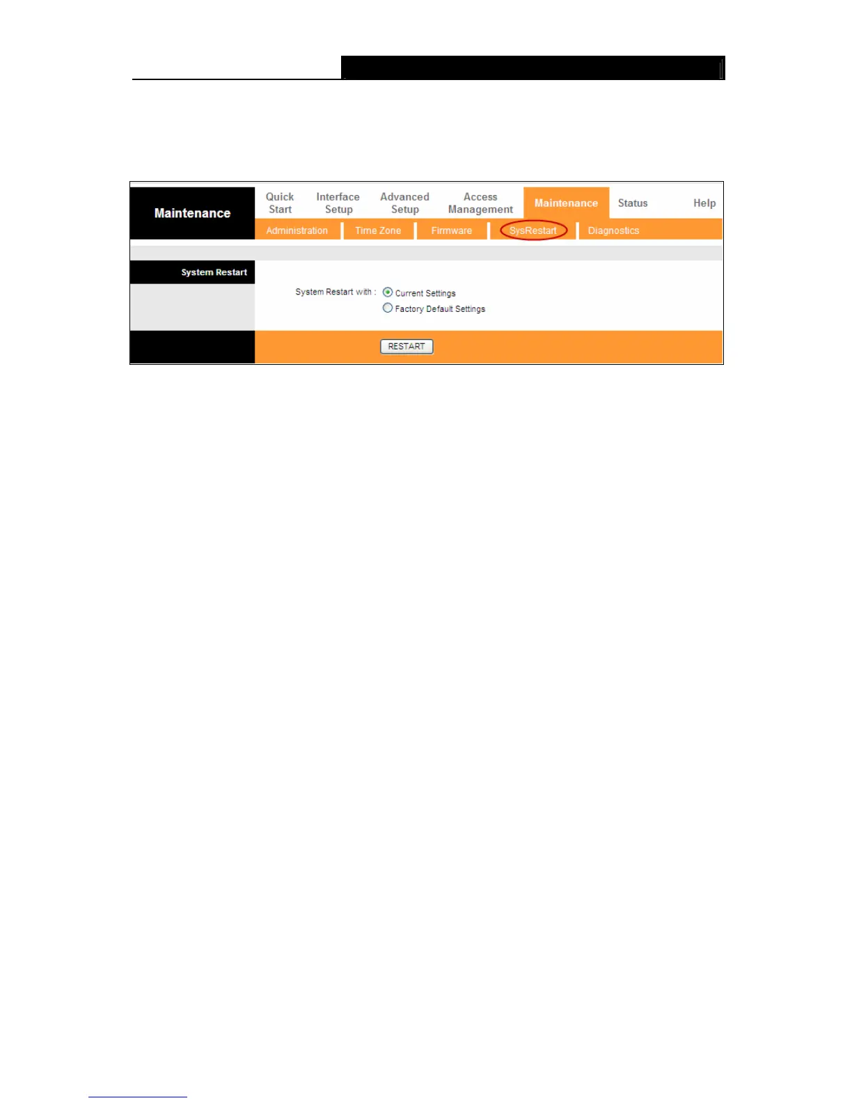 Choose “Maintenance→SysRestart”, you can select to restart the device with current settings or