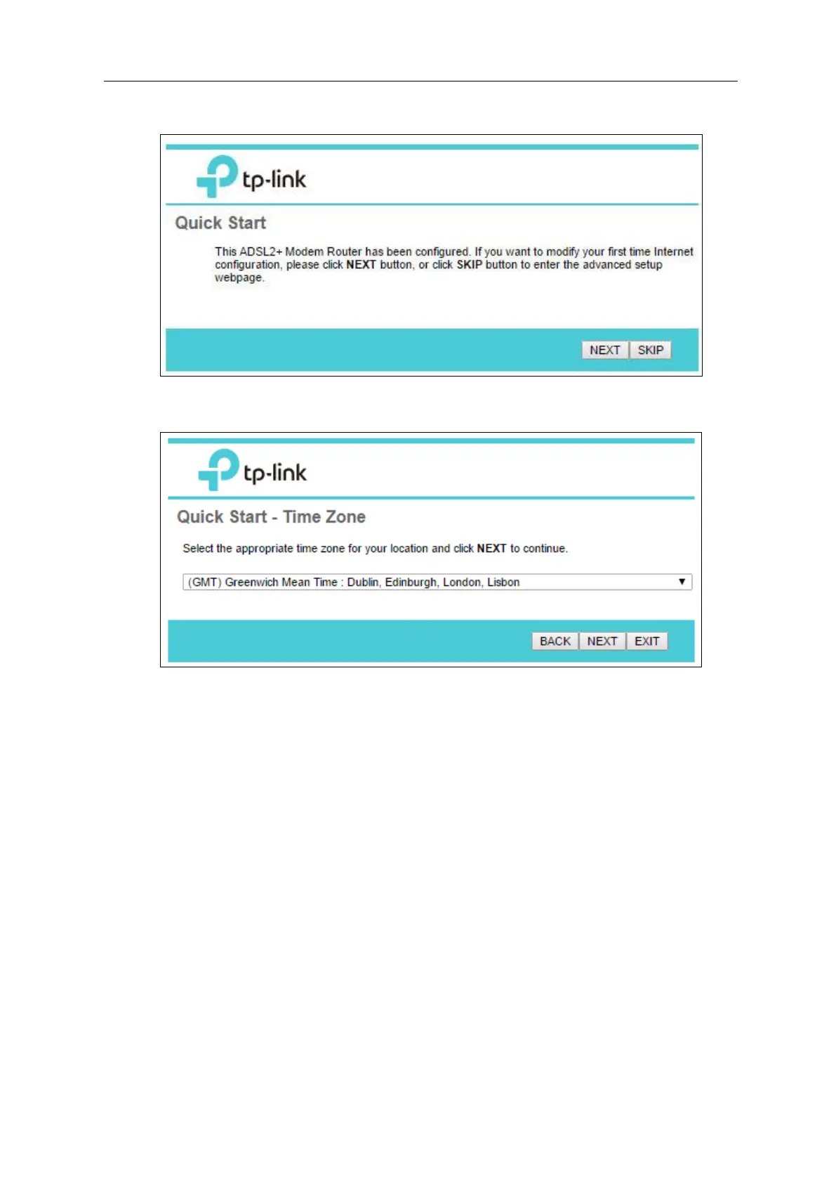 Step 2: Configure the time zone for the modem router, and then click NEXT.