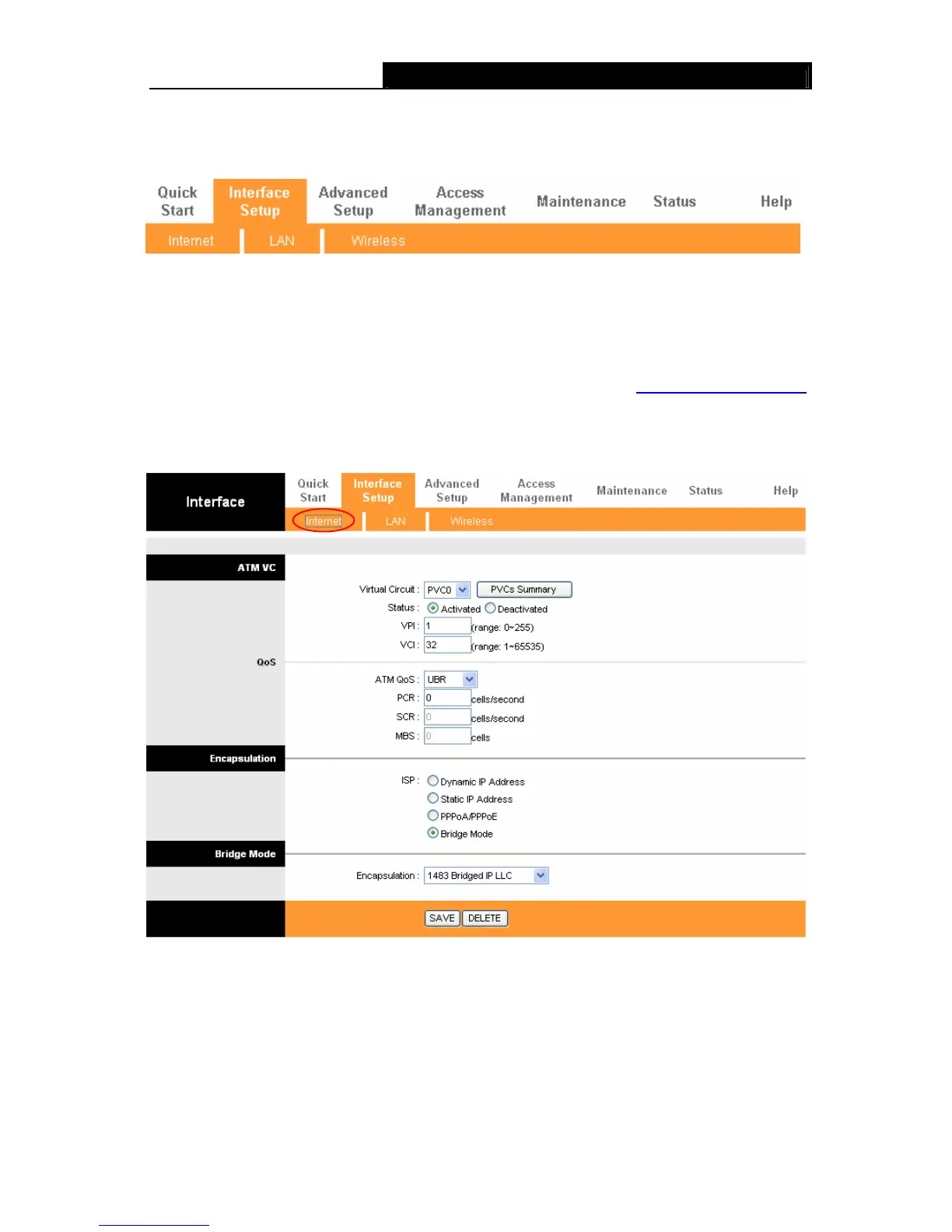 Choose “Interface Setup”, you can see the next submenus: Internet and LAN.