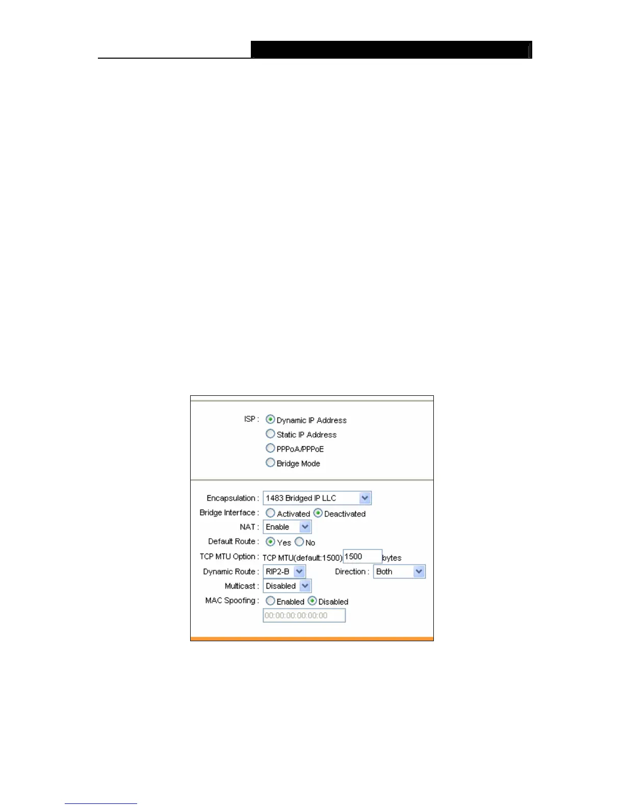 ¾ Encapsulation: Select the encapsulation mode for the Dynamic IP Address, you can leave it