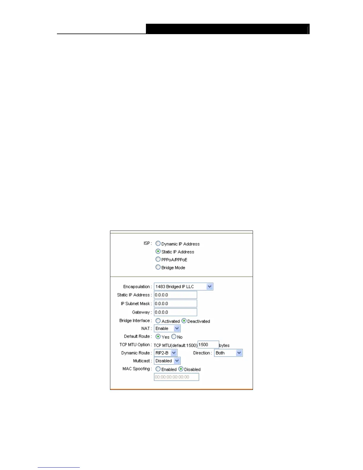 Select this option if your ISP provides static IP information to you. You should set static IP