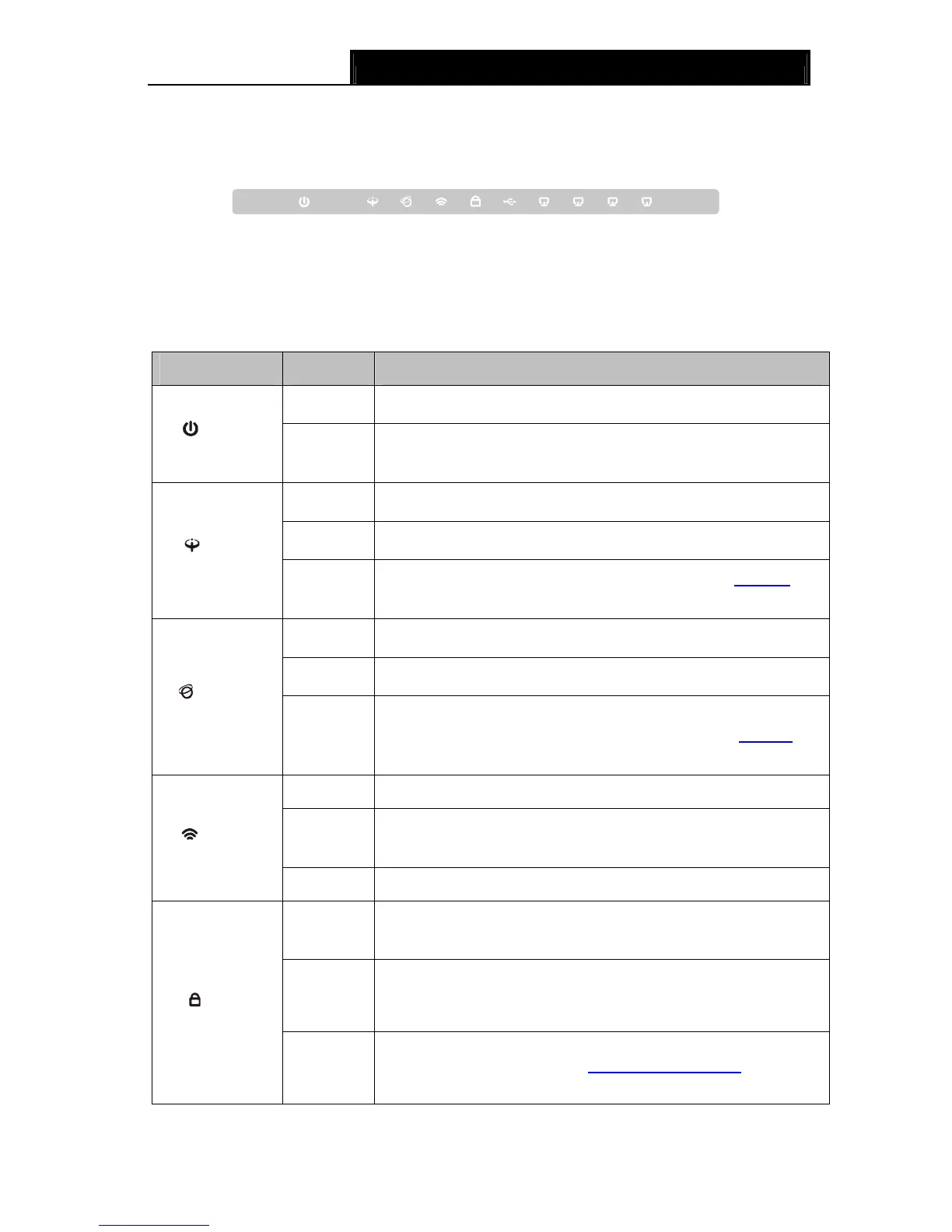 The Router’s LEDs are located on the front panel (View from left to right). They indicate the