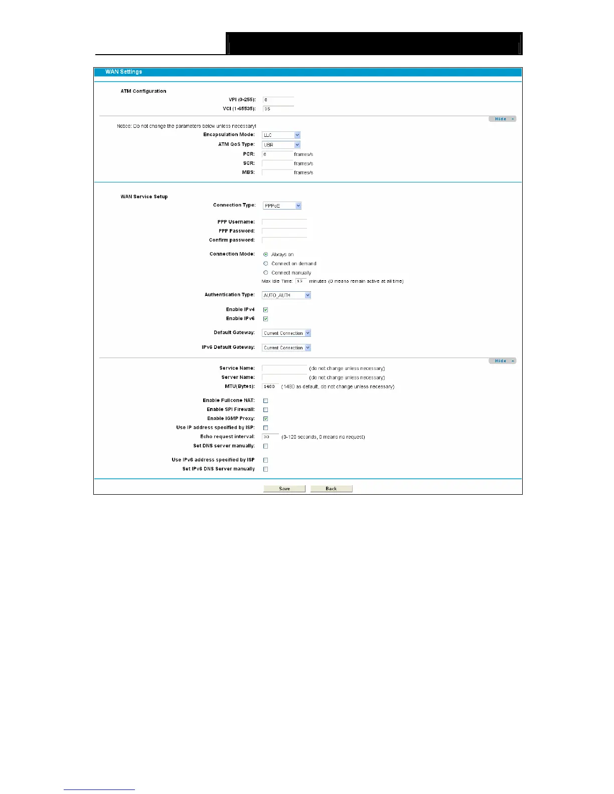 ¾ Connection Mode: For PPPoE connection, you can select Always on, Connect on demand