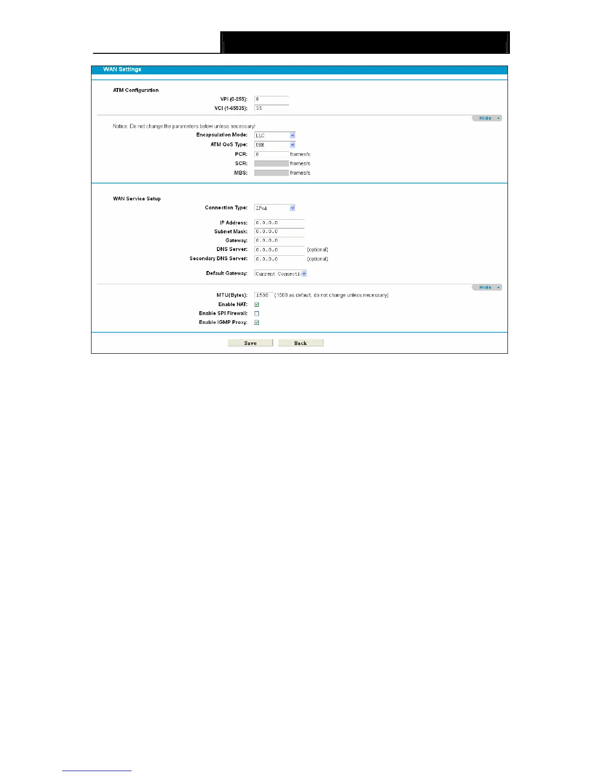 ¾ Default Gateway: select a WAN Interface from the drop-down list as the default gateway.