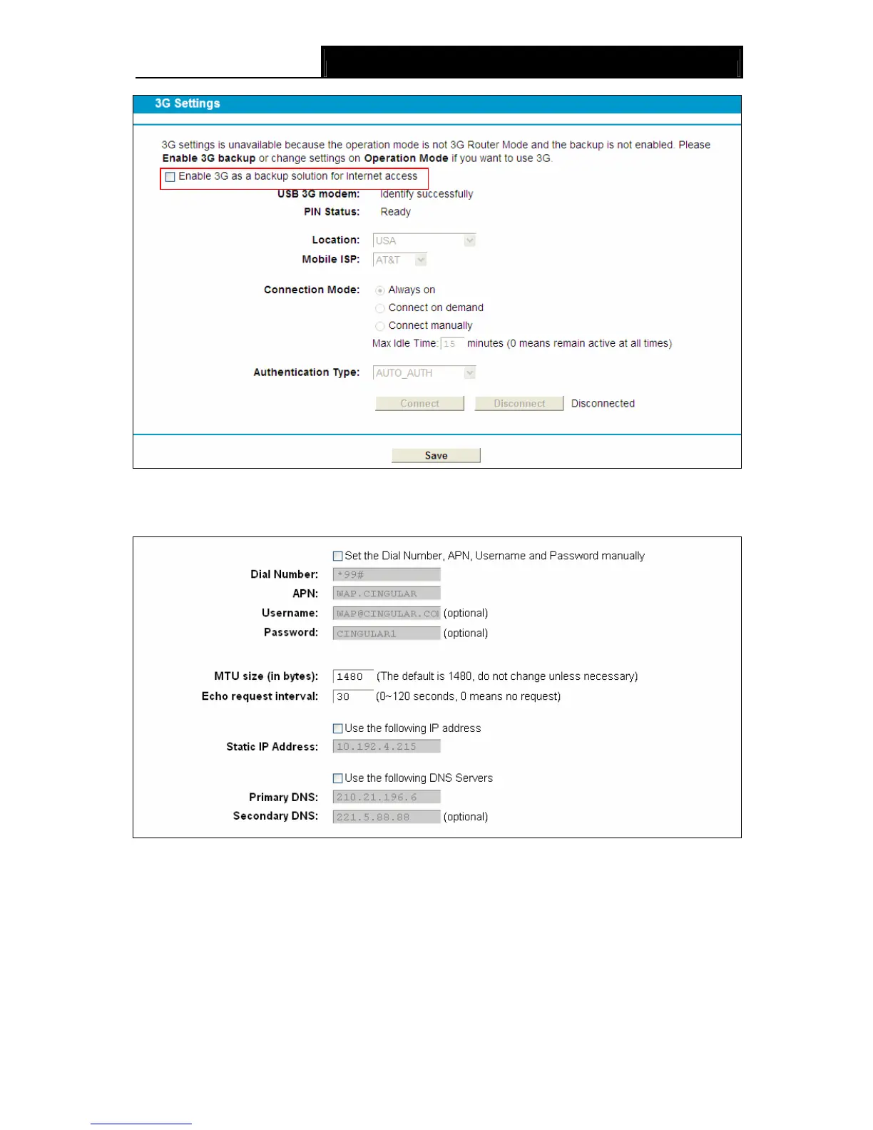 ¾ Set the Dial Number and APN manually: Check the box and fill the Dial Number and APN