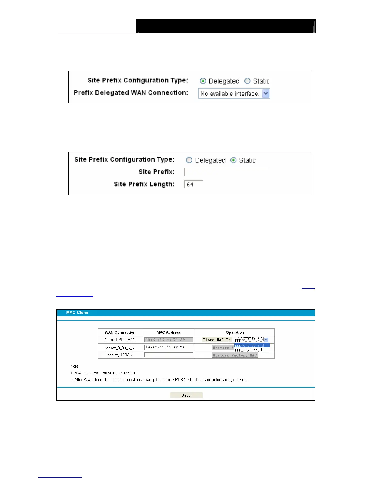 Choose menu “Advanced Setup”Æ“MAC Clone”, you can configure the MAC address of the