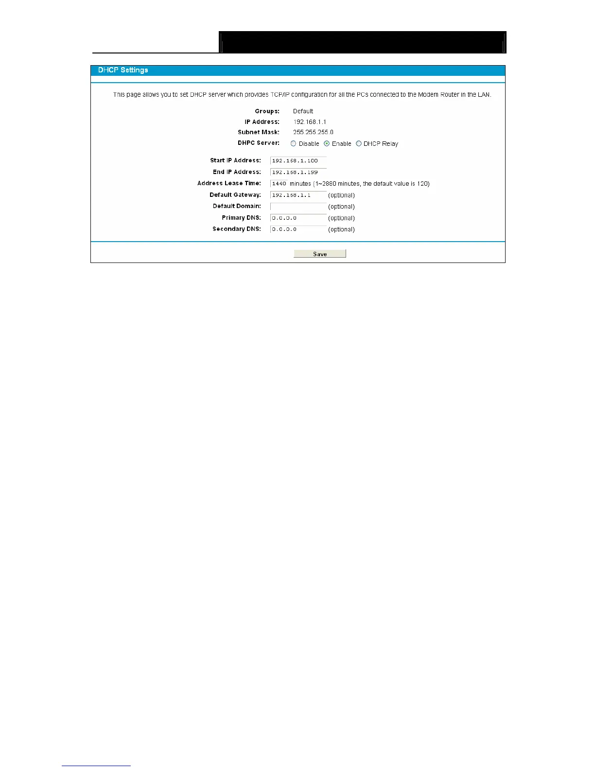 ¾ DHCP Relay: Select Relay, then you will see the next screen, and the modem router will work