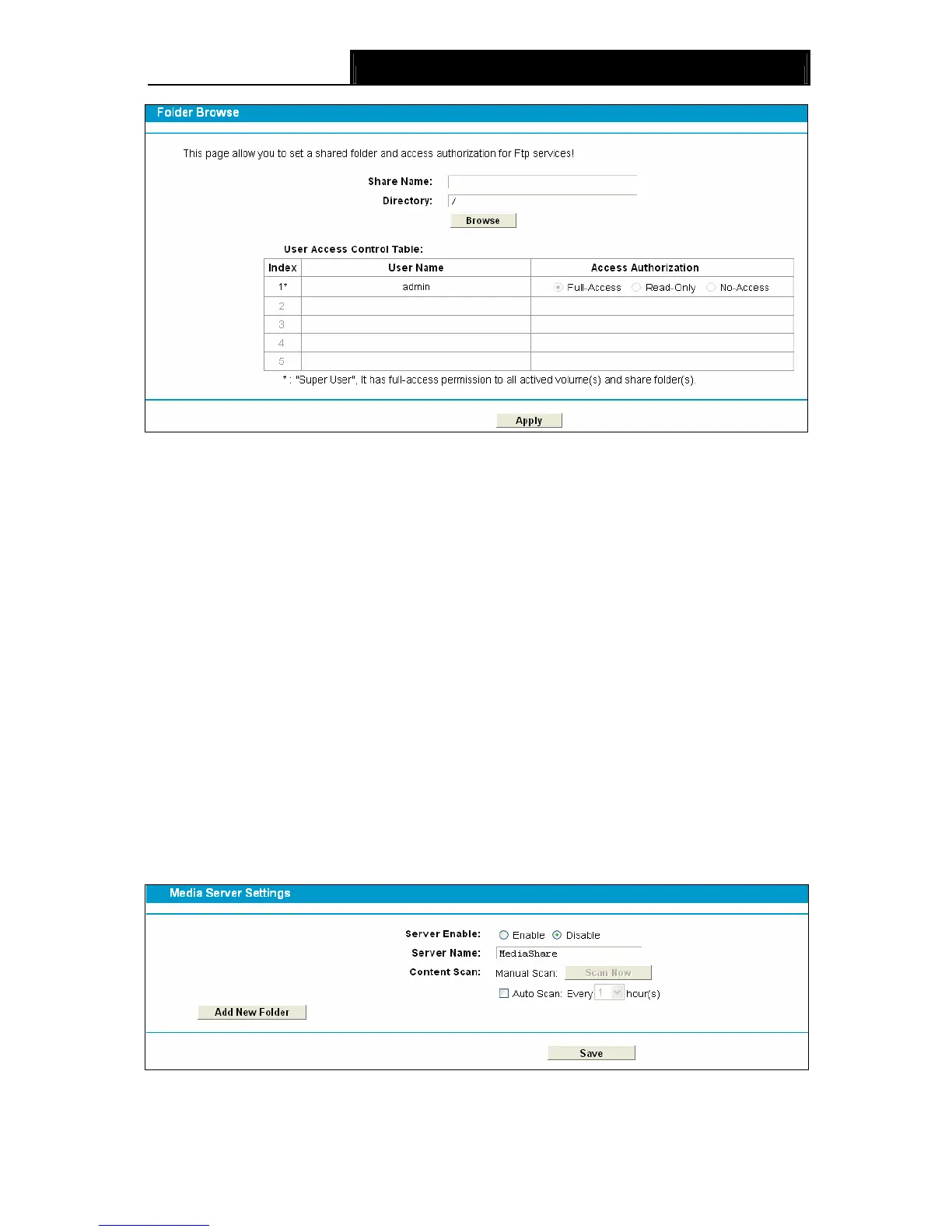 Choose menu “USB Settings”→”Media Server”, you can create media server that allows you to