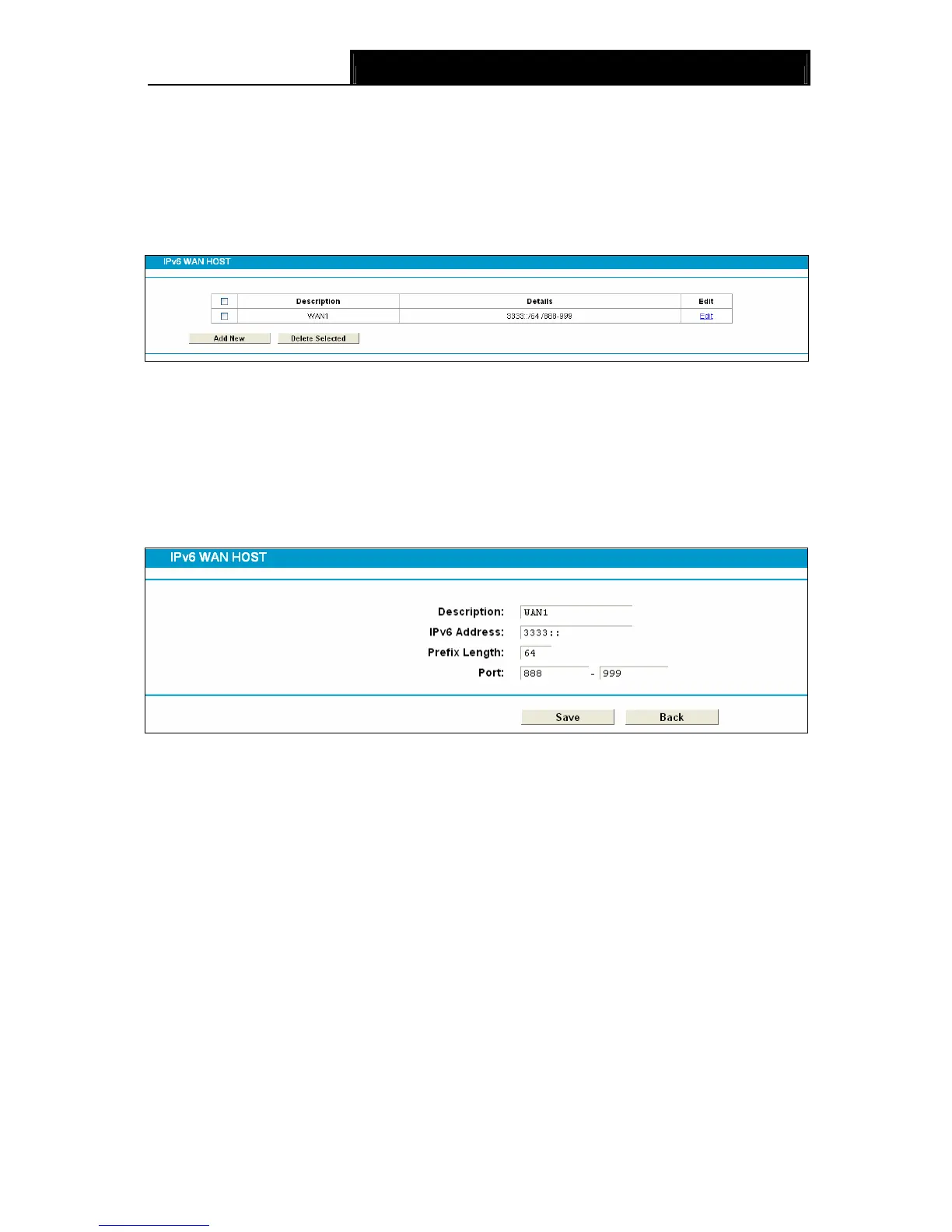 Choose menu “IPv6 Firewall” → “IPv6 WAN Host”, and then you can view and set a Host list in