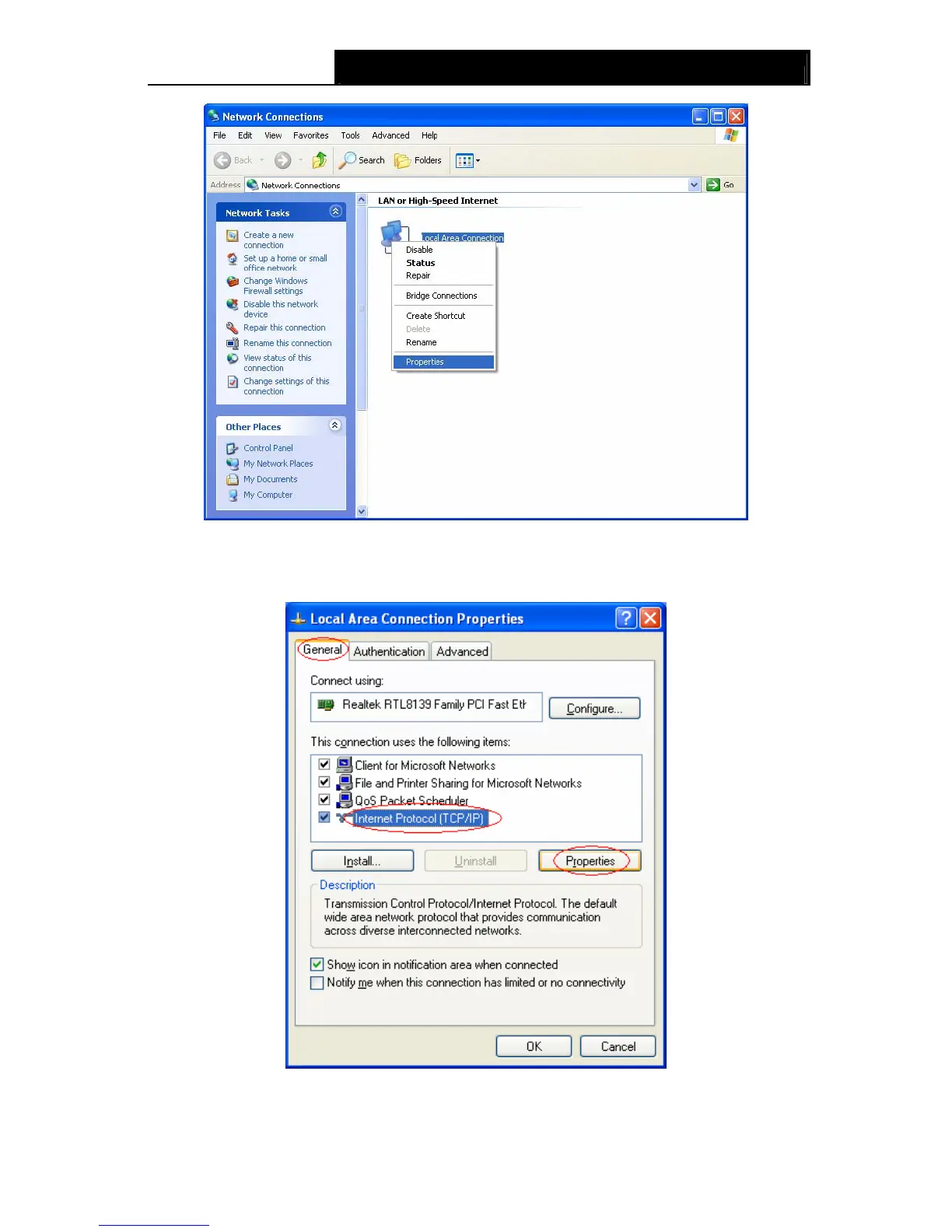 Step 3: Select General tab, highlight Internet Protocol (TCP/IP), and then click the Properties