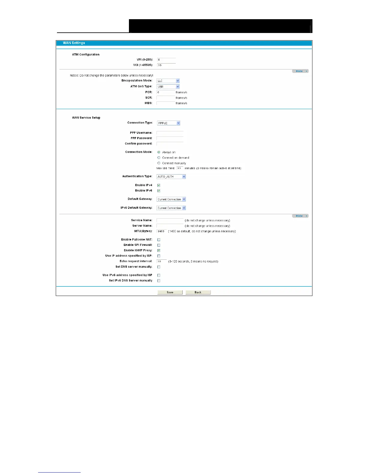¾ Connection Mode: For PPPoE connection, you can select Always on or Connect on