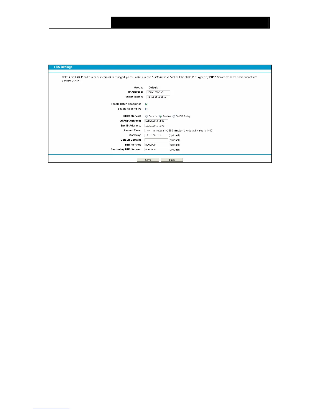Choose “Network”Æ“LAN Settings” menu, and you will see the LAN screen (shown in Figure