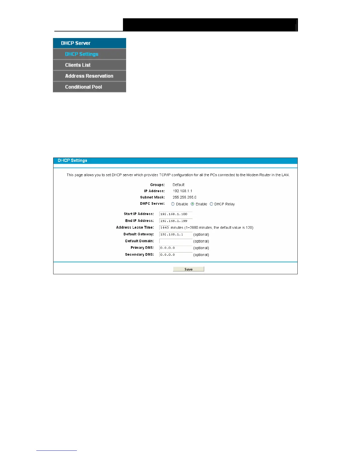 Choose menu “DHCP Server”Æ“DHCP Settings”, you can configure the DHCP Server on the
