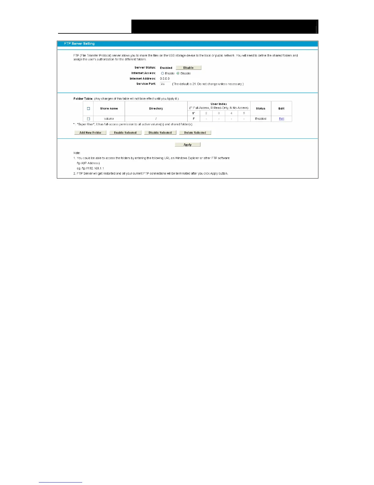¾ Internet Access: If Internet Access is enabled, user(s) in public network can access FTP