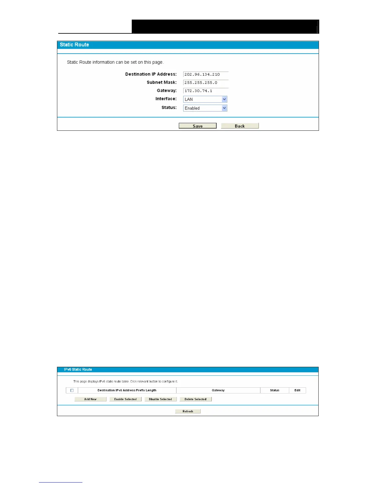 Choose “Route Settings”Æ “IPv6 Static Route”. You can see the IPv6 Static Route screen. This
