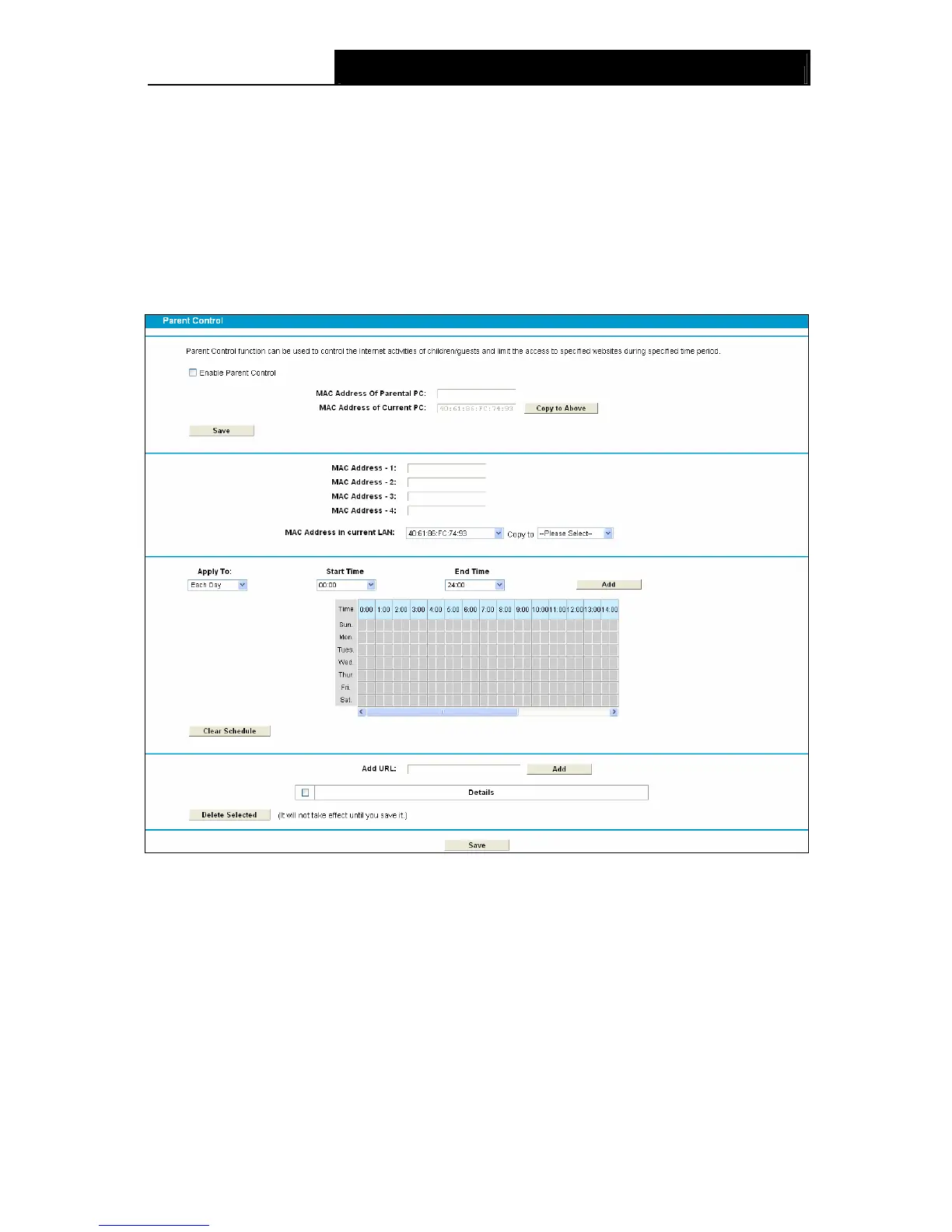 Choose menu “Parental Control”, and you can configure the parental control in the screen as