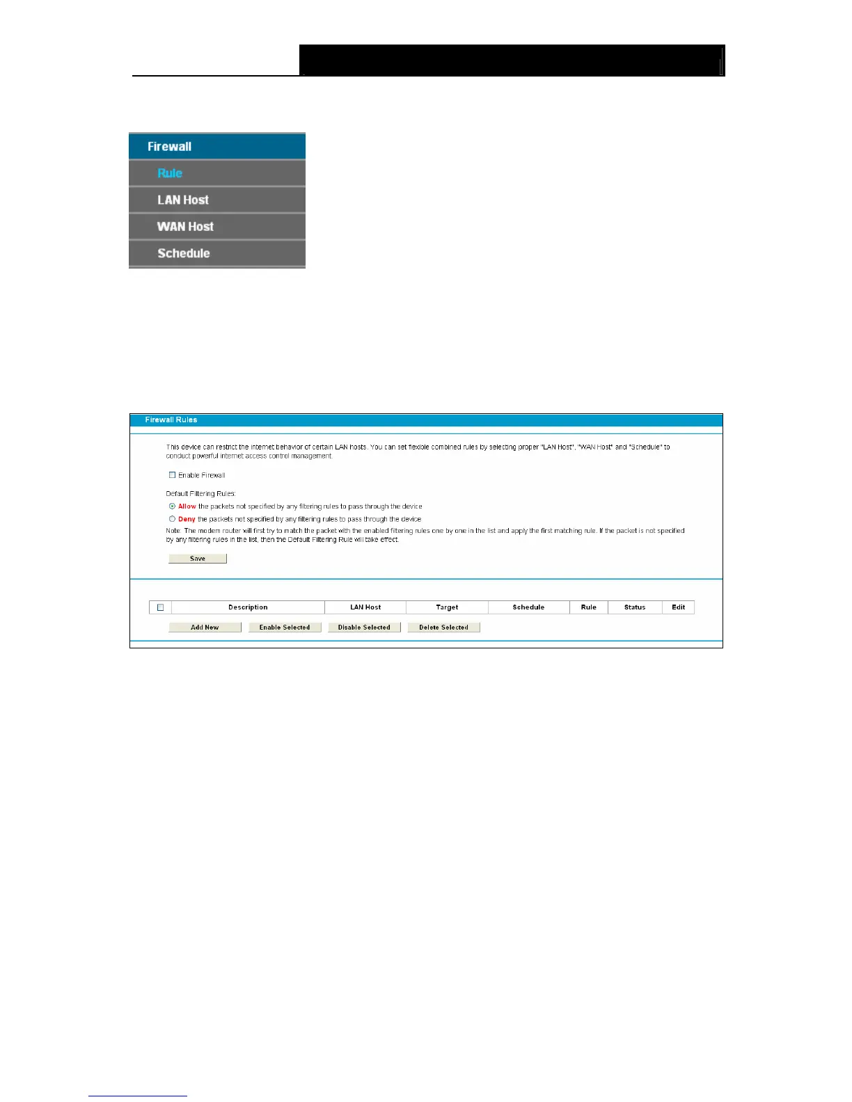 ¾ Enable Firewall: Select the check box to enable the Firewalll function, so the Default Filtering