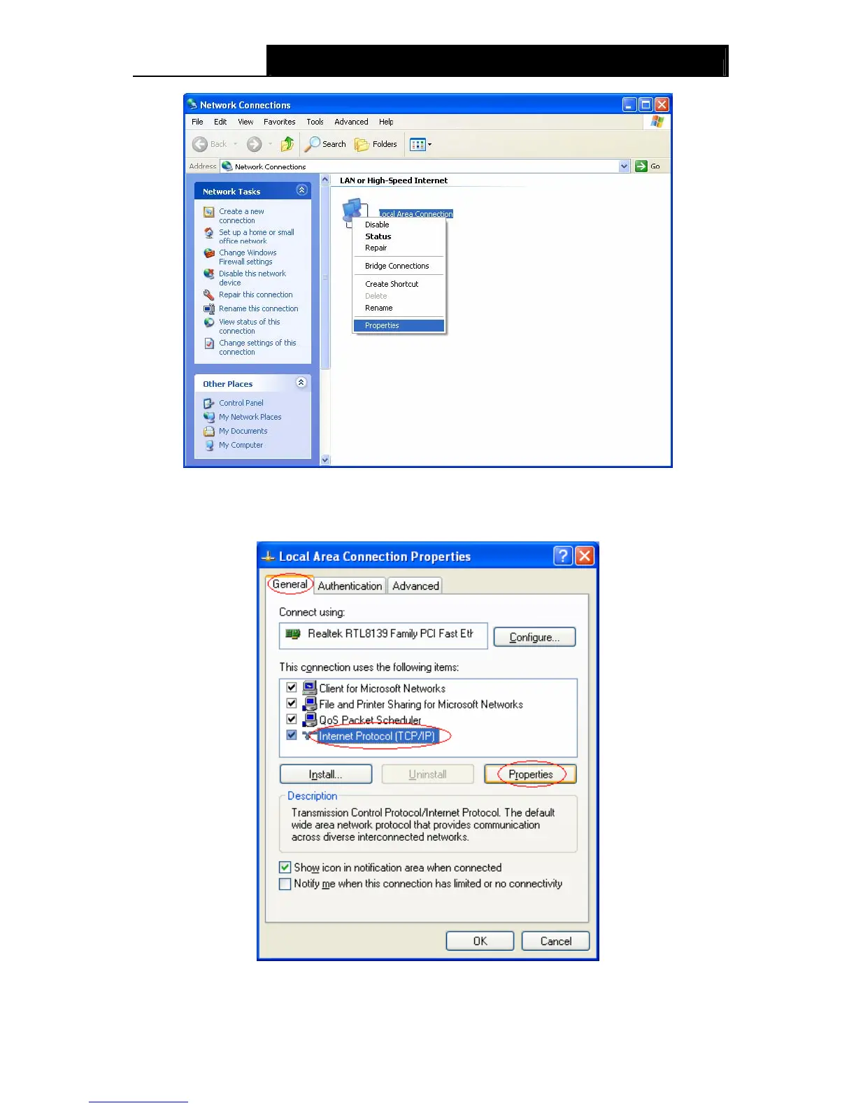 Step 3: Select General tab, highlight Internet Protocol (TCP/IP), and then click the Properties