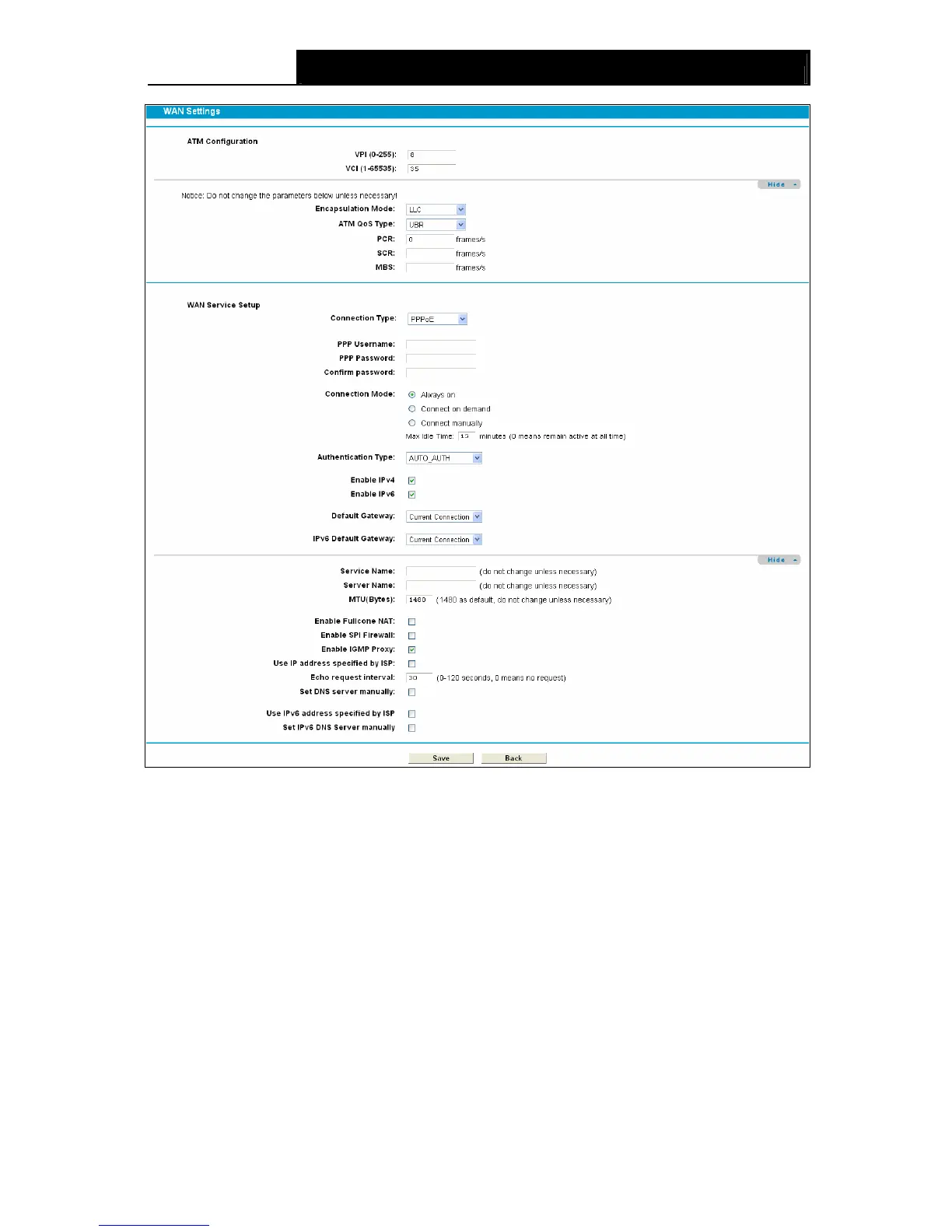 ¾ Connection Mode: For PPPoE connection, you can select Always on or Connect on