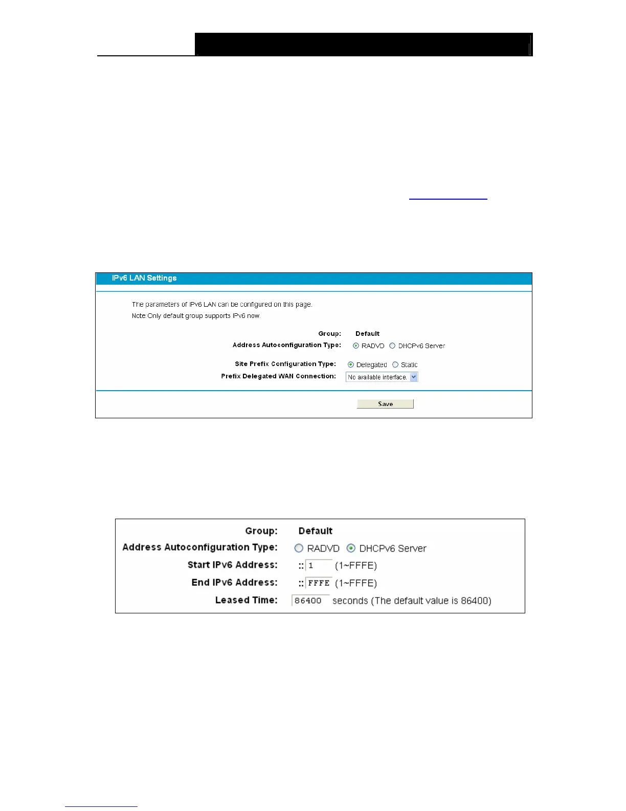 Choose menu “Network”Æ“IPv6 LAN Settings”, you can configure LAN IPv6 interface for your