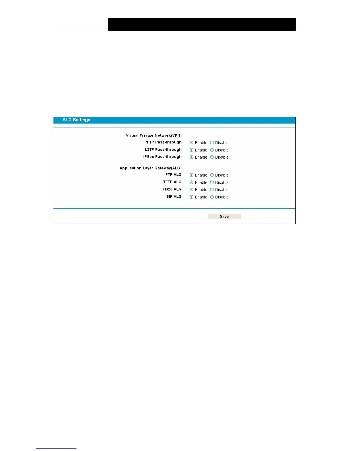 ¾ Application Layer Gateway (ALG): It is recommended to enable Application Layer Gateway