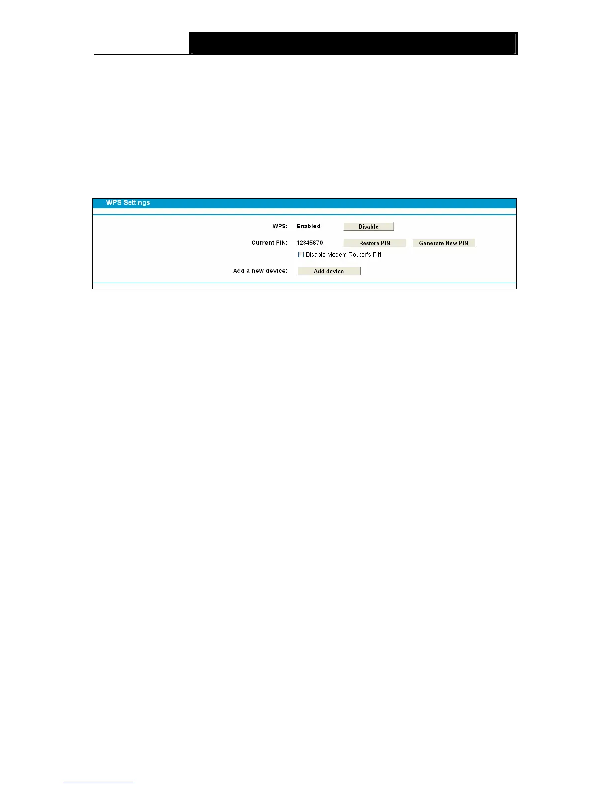 ¾ Current PIN: The current value of the modem router's PIN is displayed here. The default PIN
