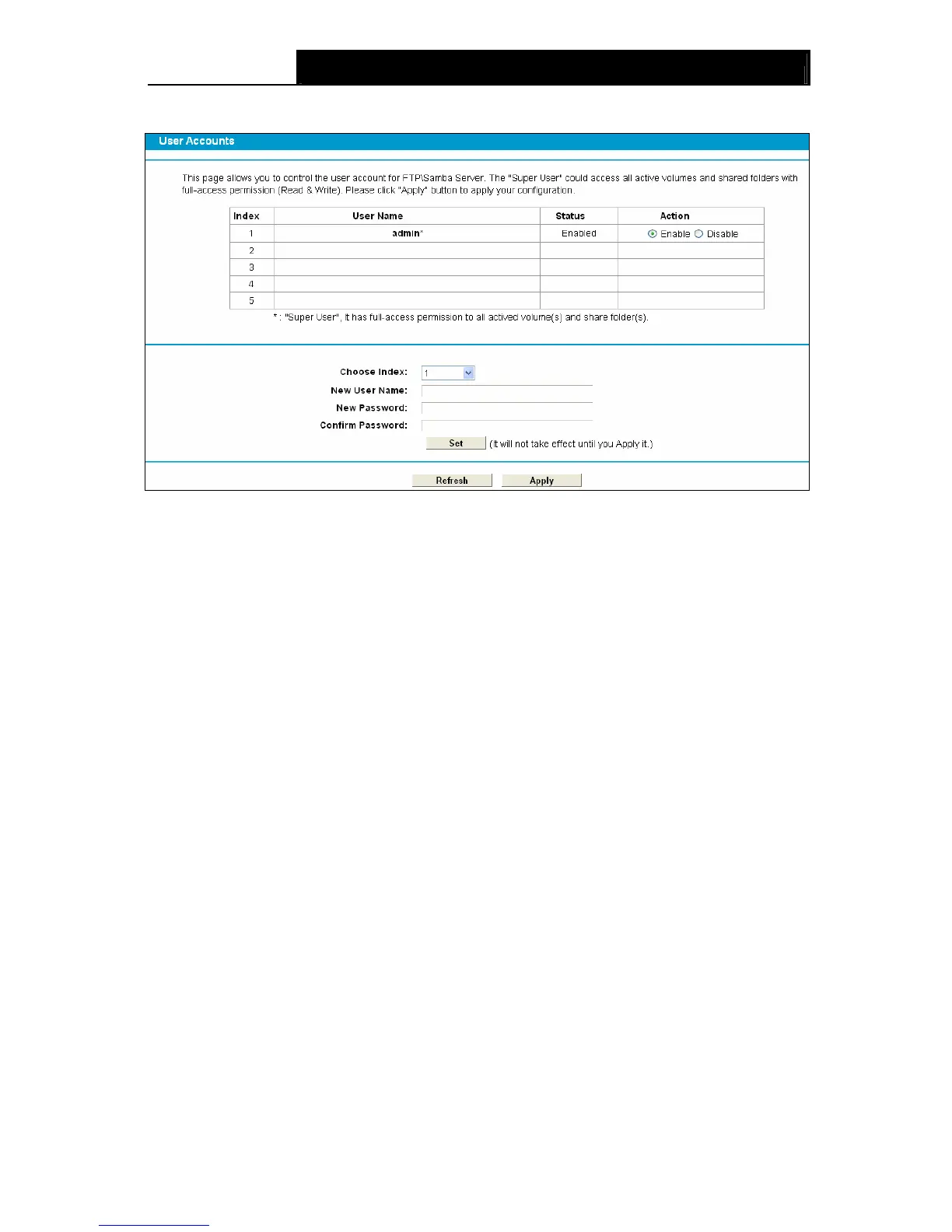 Choose menu “USB Settings” → ”Storage Sharing”, you can configure a USB disk drive