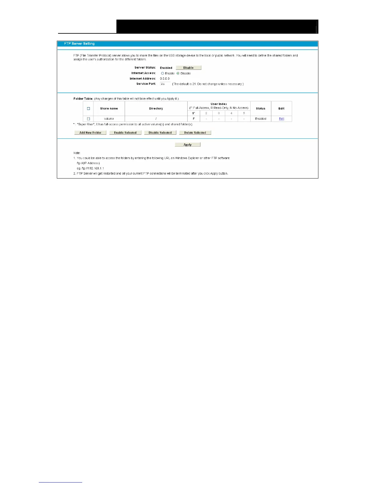 ¾ Internet Access: If Internet Access is enabled, user(s) in public network can access FTP