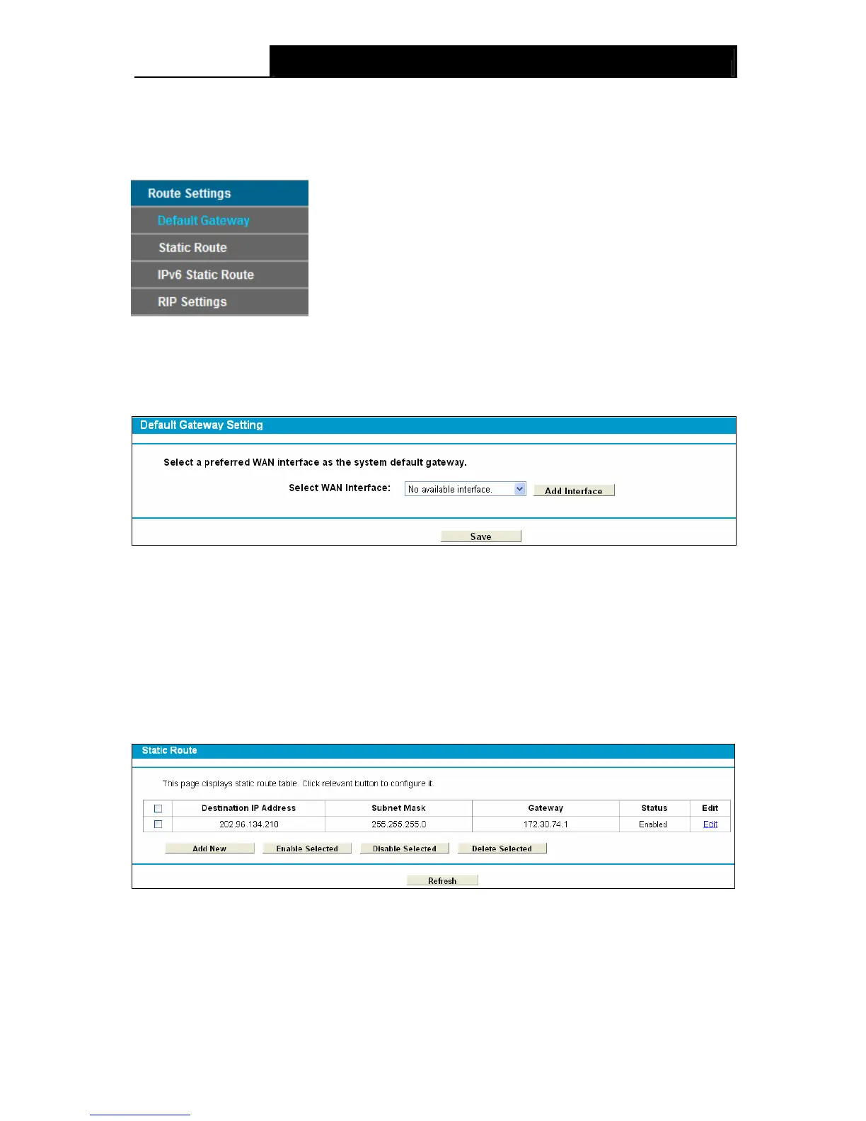 Choose “Route Settings”Æ“Default Gateway”, you can see the Default Gateway screen. You