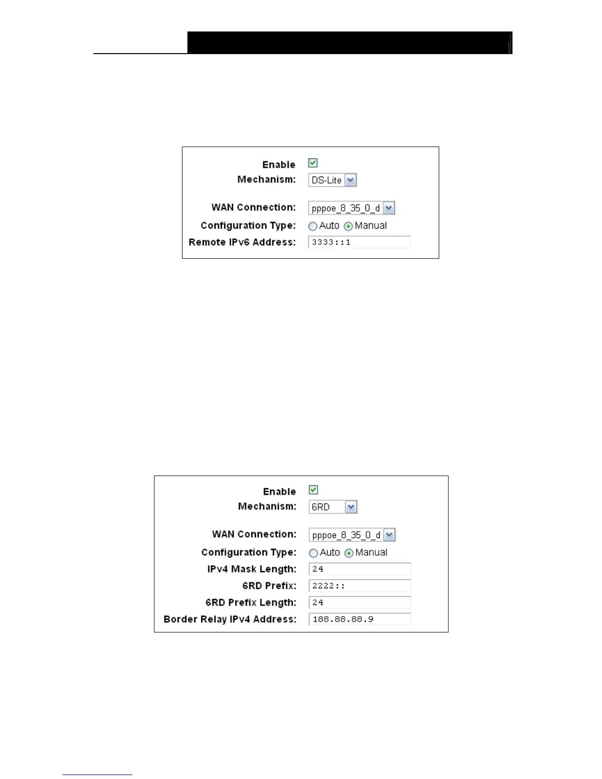 ¾ Mechanism: Select a type for IPv6 tunnel from the drop-down list. DS-Lite, 6RD and 6to4 are