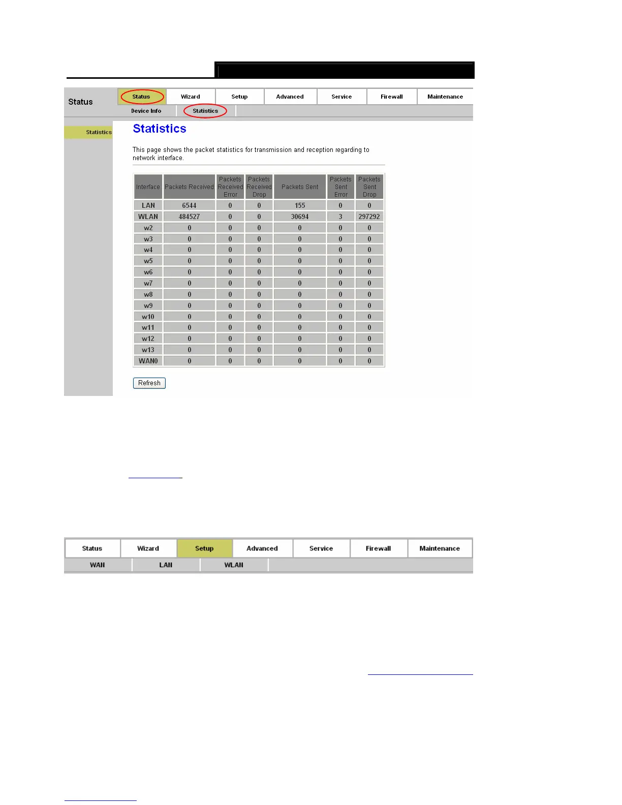 Choose “Setup”, you can see the next submenus: WAN, LAN and WLAN.